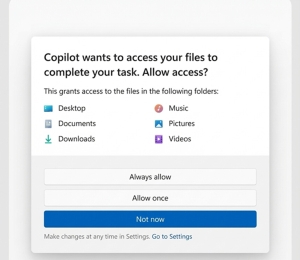 Jatkossa Copilotin tekoälyapureita käytettäessä ne esimerkiksi kysyvät erikseen lupaa päästä ainakin seuraaviin hakemistoihin: Työpöytä, Dokumentit, Lataukset, Musiikki, Kuvat ja Videot. Luvat myönnetään myös yhdelle tekoälytyökalulle kerrallaan, eikä kaikille Copilot-ominaisuuksille yhdellä kertaa. Valittavissa on pysyvän luvan antaminen, luvan pyytäminen joka kerta uudelleen tai sen evääminen kokonaan.