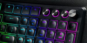 Perusnäppäinten lisäksi näppäimistön vasemmasta reunasta löytyy pyöritettävä monitoiminuppi sekä viisi makronäppäintä ja oikeasta yläreunasta puolestaan toinen pyöritettävä medianuppi, kolme pikanäppäintä sekä yhteysnäppäimet HyperSpeed Wireless -yhteydelle ja kolmelle Bluetooth-laitteelle. Yksi kolmesta pikanäppäimestä käynnistää pitkään painettuna AI Prompt Master -työkalun, jolla voi luoda sähköposteja, tiivistää tekstiä ja uudelleen sanoittaa tekstiä helposti haluamaansa kielimallia käyttäen. Valitettavasti Razer ei tarkemmin kerro pikanäppäimistä, mutta ikonin perusteella yksi niistä liittyy tavalla tai toisella akkuun.