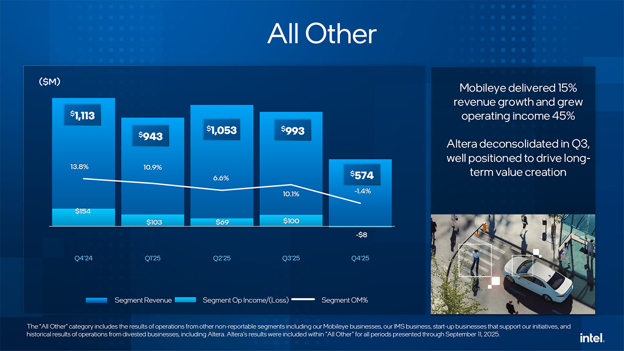 Intelin kaikki muut osastot yhteen paketoiva All Other -kategoria teki viime vuoden viimeisellä neljänneksellä vain 574 miljoonaa liikevaihtoa, josta koitua 8 miljoonan edestä tappiota. Vuotta aiemmin vuoden 2024 viimeisellä neljänneksellä liikevaihto oli 1113 miljoonaa dollaria ja tulos 154 miljoonaa plussalla. Dramaattista eroa selittää etenkin Alteran irrottaminen Intelistä vuoden 2025 kolmannellä neljänneksellä.