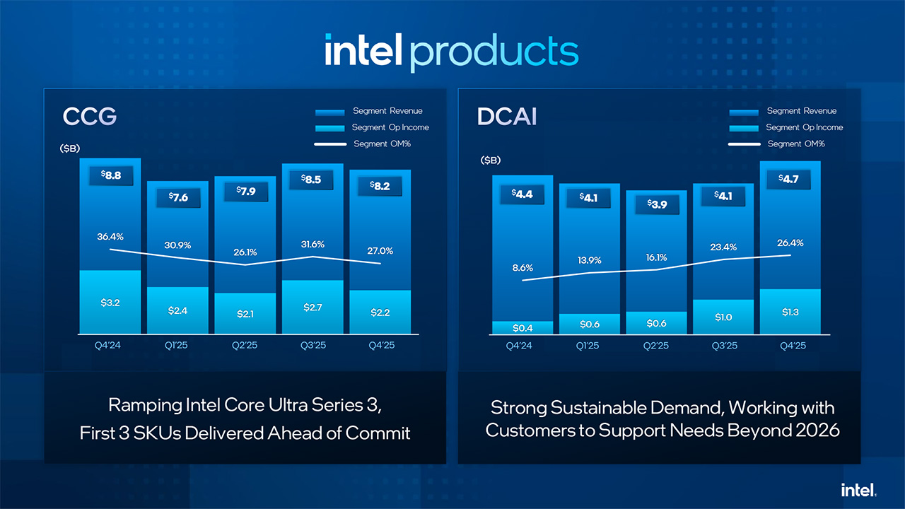 Osastokohtaisesti katsottuna Intelin kuluttajapuolen CCG-osasto teki 8,2 miljardin dollarin liikevaihdon, josta jäätiin plussalle 2,2 miljardia dollaria. Vuotta aiemmin viimeisen neljänneksen liikevaihto oli 8,8 miljardia dollaria ja tulot 3,2 miljardia.