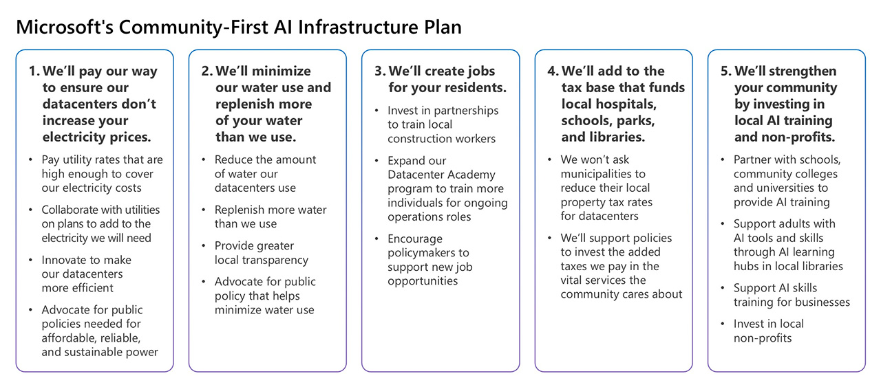Kritiikki on näkynyt myös politiikan tasolla, kun esimerkiksi Yhdysvaltain presidentti Donald Trump on todennut, että tekoäly-yritysten on maksettava omat kulunsa eikä sysätä niitä yhteiskunnan harteille. Microsoft on tarttunut aiheeseen muun muassa muuttamalla tapaa, jolla se rakentaa datakeskuksiaan. Yhtiö lupaa, ettei sen datakeskukset tule nostamaan sähkön hintaa edes paikallisesti, minimoi veden käytön ja jopa palauttaa kiertoon enemmän vettä kuin käyttää, luo paikallisia työpaikkoja sekä rahoittaa julkisia toimintoja ynnä sijoittaa siinä ohessa paikallisiin voittoa tavoittelemattomiin järjestöihin. Nyt myös OpenAI on luvannut sen tulevien Stargate-ohjelman datakeskusten huomioivan paikalliset yhteisöt vastaavaan tapaan ja vannoo, ettei sähkölaskut tule nousemaan niiden vuoksi. OpenAI:n mukaan jokaisen Stargate-palvelinkeskuksen ”Stargate Community Plan” tullaan suunnittelemaan kunkin ympäristöön parhaiten sopivaksi geneerisen mallin sijasta.