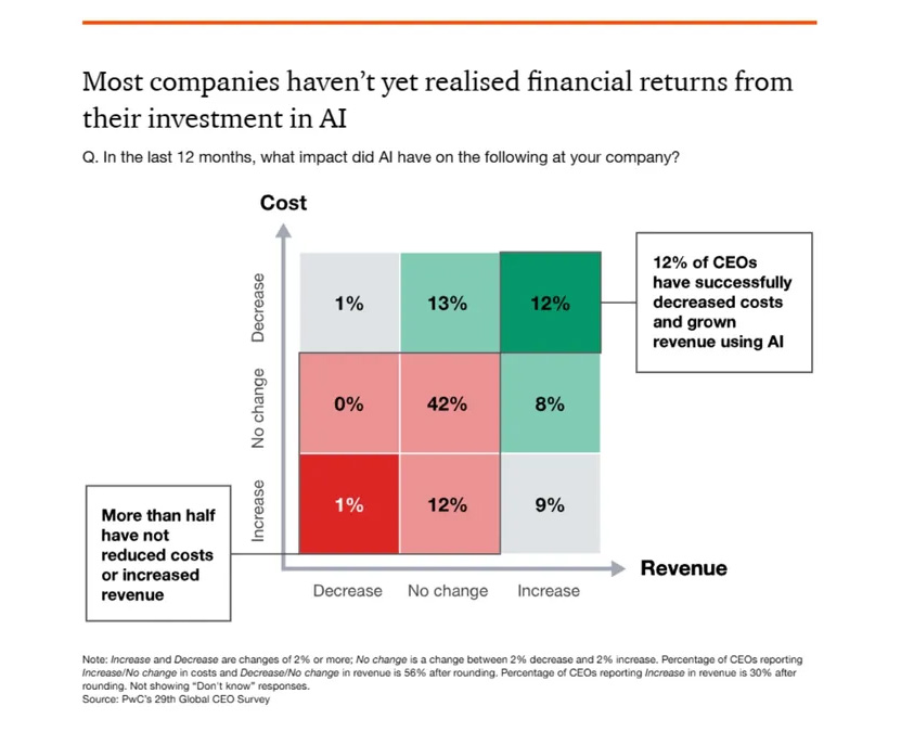 Tutkimuksen mukaan todellisuus ei tällä hetkellä ole yritystenkään kannalta turhan ruusuinen; selvästi alle puolet yrityksistä on kokenut hyötyä tekoälyn hyödyntämisestä. Kyselyyn osallistuneista toimitusjohtajista ylivoimainen enemmistö eli 42 % kertoo, ettei heidän yrityksensä ole saanut tekoälyä hyödyntämällä pienennettyä kulujaan tai kasvatettua liikevaihtoaan. 12 % toteaa, että yhtiön kulut ovat nousseet ilman että liikevaihto olisi kasvanut ja prosentti että yhtiön kulut ovat nousseet ja liikevaihto vielä pienentynyt päälle. Positiivisella puolella 12 % kertoo yhtiön liikevaihdon kasvaneen samalla kun kulut ovat pienentyneet, 13 % kulujen pienentyneen ilman muutosta liikevaihtoon ja 8 % liikevaihdon kasvaneen ilman muutoksia yhtiön kuluihin.