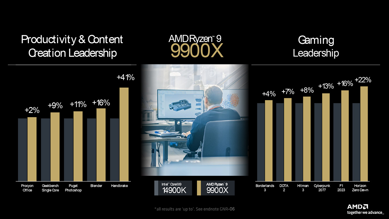 Suorituskyvyn osalta AMD kehuu Ryzen 9 9900X:n peittoavan Intelin Core i9-14900K:n prosessorisuorituskyvyssä 2-41 %:n erolla tehtävistä riippuen, kun peleissä eroa on kuuden pelin valikoimalla 4-22 %. Vastaavasti yhtiö kertoo Ryzen 7 9700X:n peittoavan Core i7-14700K:n 4-42 %:lla prosessorisuorituskyvyssä ja 4-31 %:lla pelisuorituskyvyssä. Ryzen 5 9600X:n vastaavat luvut Core i5-14600K:ta vastaan ovat puolestaan 8-94 % ja 5-29 %. Testeissä oli näytönohjaimena Radeon RX 7900 XTX.