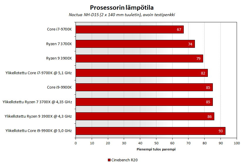 Huom! Suora lämpötilojen vertailu Intelin ja AMD:n prosessoreiden kesken ei ole mahdollista, sillä mittausprosessiin liittyy liian monta muuttujaa kahdella täysin erilaisella alustalla, vaikka käytössä on sama cooleri. Tulokset ovat suuntaa antavia.