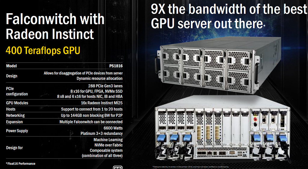 MI25-kiihdyttimen FP16-suorituskyky on puolitarkkuuden liukuluvuilla 25 teraflopsia ja FP32-suorituskyky perustarkkuuden liukuluvuilla 12,5 teraflopsia. Vertailun vuoksi NVIDIAn Pascal-arkkitehtuuriin perustuvan HBM2-muisteilla varustetun GP100-grafiikkapiirin FP16-suorituskyky on 21,2 teraflopsia ja FP32-suorituskyky 10,6 teraflopsia.