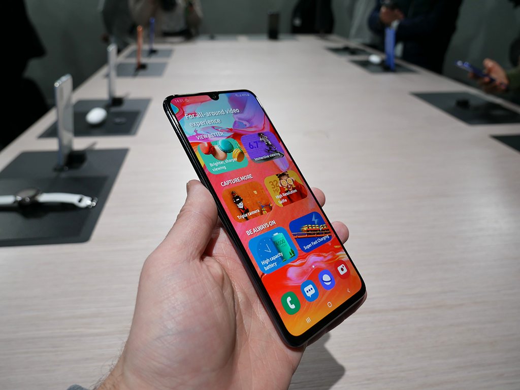 Tilaisuudessa julkaistiin myös jo aikaisemmin ”paperilla” julkaistu Galaxy A70. Puhelin tulee sijoittumaan myös ylempään keskihintaluokkaan ja sen suurimpana erikoisuutena on suuri akku sekä isolla megapikselimäärällä varustettu päätakakamera.
