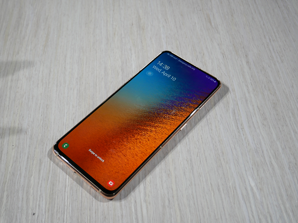 Näytön yläreunassa ei ole lainkaan näkyvää kuuloketta, vaan näytön pinta toimii kuulokkeena – ääni johdetaan värähtelynä näytön läpi. Samanlaisia ratkaisuja on viime aikoina nähty mm. Huawein juuri julkaistussa P30 Pro -puhelimessa. Toteutuksen äänenlaatua emme päässeet testaamaan vielä ensituntumien yhteydessä.