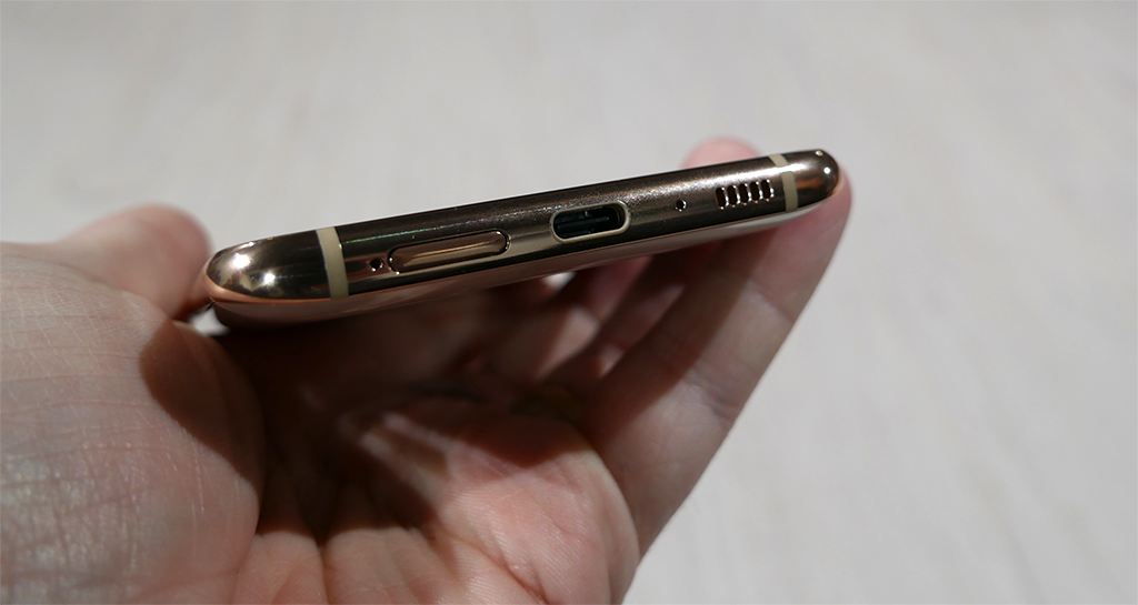 Alapäädyn asettelu ei yllätyksiä tarjoille. Alareunasta löytyy USB Type-C -latausliitin ja sen toiselle puolelle on sijoitettu laitteen kaiutin. SIM-korttikelkka on sijoitettu latausliittimen vasemmalle puolelle. Samalla on luovuttu 3,5 mm ääniliitännästä. Alapäädyn molemmissa reunoissa on toteutettuna myös antenniraidat. Huomionarvoisena yksityiskohta myös puhelimen rungon molemmilla pitkällä sivulla on erilliset antenniraidat parantamassa kuuluvuutta heikossa kentässä. Näytön ja alapäädyn väliin on jätetty pieni leukakaistale, joka on kooltaan hieman kookkaampi kuin uusissa Galaxy S10 huippumalleissa.