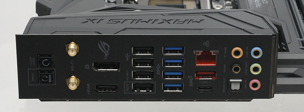 I/O-suojus on integroitu kiinteästi emolevyyn ja liittimien joukosta löytyy BIOSin nollausnappi, USB BIOS Flashback -nappio BIOSin päivittämiseen USB-tikulta ilman prosessoria ja muita komponentteja, Wi-Fi-antennin liitännät, DisplayPort- ja HDMI-näyttöliittimet, neljä USB 2.0- ja neljä USB 3.0 -porttia, RJ-45-verkkoliitin, Type-A- ja Type-C-malliset USB 3.1 -liittimet sekä optinen S/PDIF-liitin ja viisi kullattua 3,5 millimetrin analogista ääniliitintä.