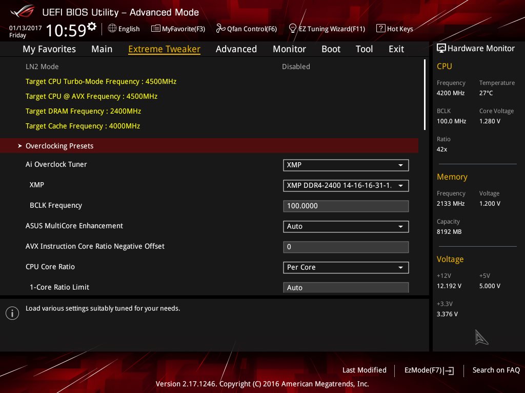 Asuksen UEFI BIOS Utilityn käyttöliittymästä Advanced-tilassa prosessorin, muistien, väylätaajuuksien, käyttöjännitteiden ja virransyötön säädöt löytyvät Formulan Extreme Tweaker -valikon sijaan AI Tweaker -valikon alta. Eri säätömahdollisuuksia on tarjolla jonkin verran rajatummin kuin Formula-mallissa, mutta käytännössä kaikki normaaliin ja ylikellotuskäyttöön tarvittavat säädöt ovat tarjolla.