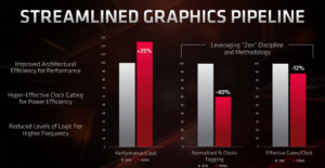 Samalla tehonkulutuksella RDNA:n puolestaan kerrotaan tarjoavan 50 % parempaa suorituskykyä kuin GCN. AMD on pilkkonut ilmoittamansa suorituskykyparannuksen osiin ja yli 50 % tulee arkkitehtuurin paremmasta IPC-suorituskyvystä, reilu 20 % 7 nm:n prosessin eduista ja reilu 10 % korkeammasta kellotaajuudesta ja virrankulutuksen parannuksista.