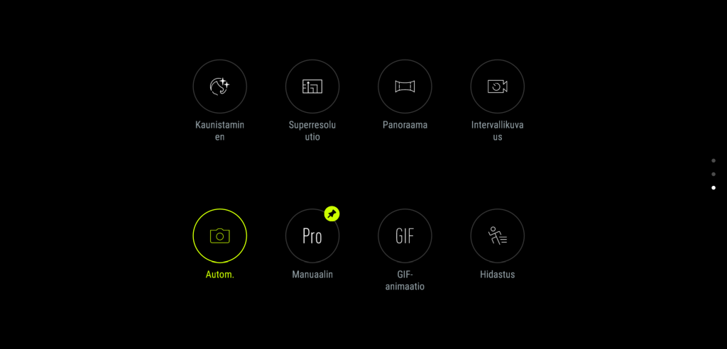 Pro-tilaksi nimettyyn manuaalikuvaustilaan pääsee käsiksi joko kuvaustilavalikosta tai kuvausnäkymän alanurkan pikapainikkeesta (johon voi määrittää halutessaan myös jonkin muun kuvaustilan). Pro-tila tarjoaa monipuoliset säädöt sekä RAW-kuvausmahdollisuuden.