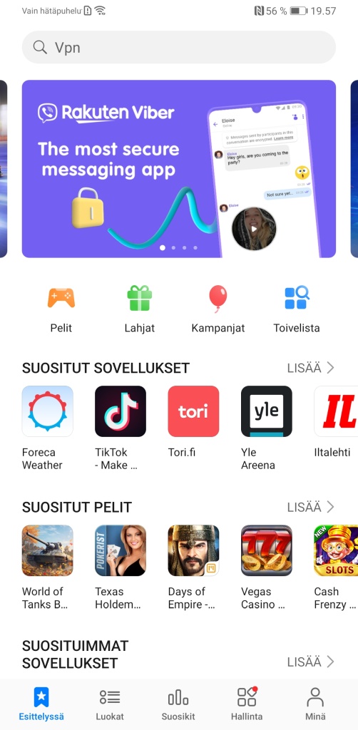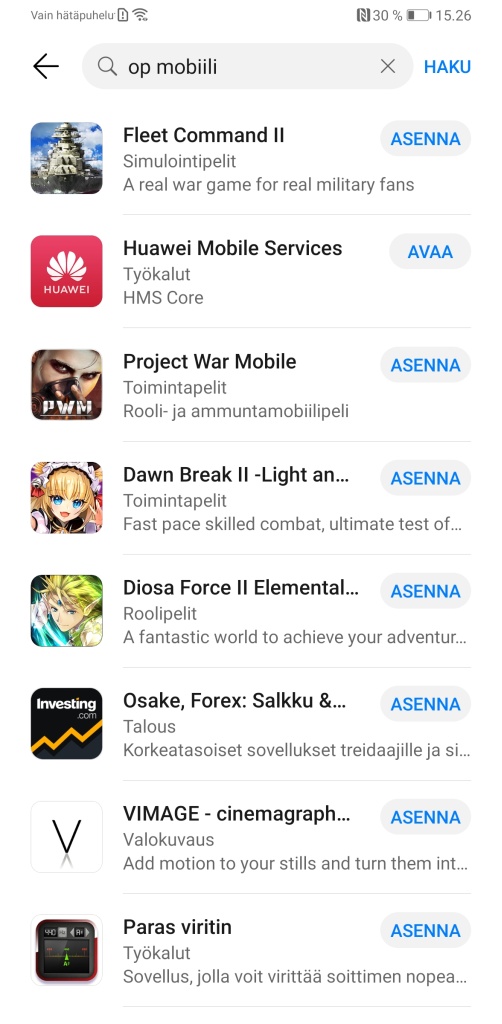Ei löydy suomalaisten pankkien sovelluksia AppGallerystä, eikä oikeastaan löydy mitenkään helposti muistakaan palveluista eli nämä jää hyvin pitkälti asentamatta.