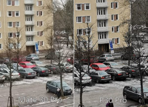 Telekameran polttoväli on puhelimissa eri, eli P30 Pron 5x zoomilla pääsee natiivisti lähemmäs kohdetta, joka on kuvaustilanteesta riippuen etu tai haitta. Mate 30 Pron telekameran 3x zoomilla kuvanlaatu on P30 Prota parempaa, sillä P30 Pro joutuu muodostamaan kuvan yhdistelemällä pääkameran ja telekameran dataa, jonka myötä kuvista tulee värimaailmaltaan hailakoita ja yksityuiskohdiltaan hieman heikompia. 5x-zoomikertoimella Mate 30 Pro tarjoaa puolestaan hybridizoomin, jonka tarkkuus on P30 Pron natiivizoomia heikompaa, mutta värintoisto puolestaan parempaa. Kokonaiskuvaa katsoessa eroa ei ole juurikaan nähtävissä. Heikossa valossa molempien puhelimien telekameroilla on taipumus siirtyä heikossa valossa käyttämään pääkameralta otettavaa rajausta ja siinä touhussa Mate 30 Pro suoriutuu selvästi paremmalla lopputuloksella