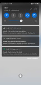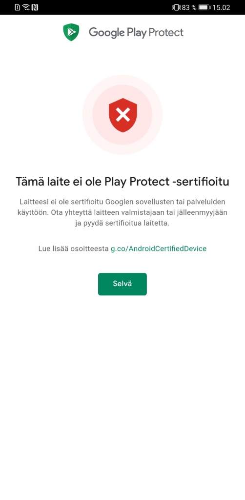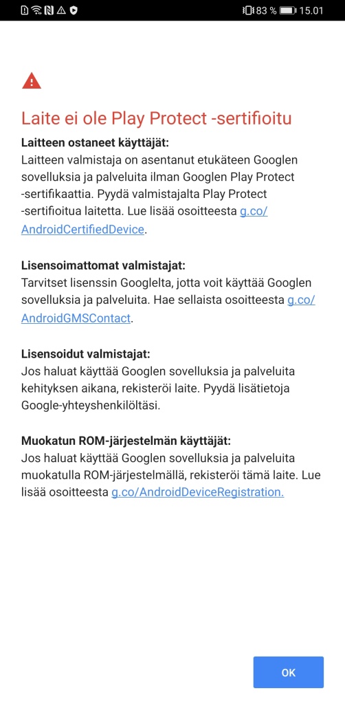 Kokeilimme kuitenkin sovellusta Mate 30 Prossa, mutta valitettavasti laihoin tuloksin. Kun Chat Partner on asennettu puhelimeen, sovelluksesta valitaan korjaustoiminto ja sille annetaan luvat tiettyjen järjestelmätoimintojen käyttöön, jonka jälkeen se asentaa Googlen palvelut ja Play-kaupan. Uudelleenkäynnistyksen jälkeen niiden pitäisi olla toiminnassa, mutta valitettavasti emme kuitenkaan saaneet niitä toimimaan testikappaleessamme, vaan puhelin herjasi Play Protect -sertifionnin puuttumista, vaikka kokeilimme vielä erillistä Play Protect -sertifikaatin korjauskikkaa. Maininnan arvoisena seikkana sovelluksen on myös raportoitu kalastelevan käyttäjän Google-tunnuksia feikki-kirjautumisnäkymän muodossa heti asennuksen jälkeen.