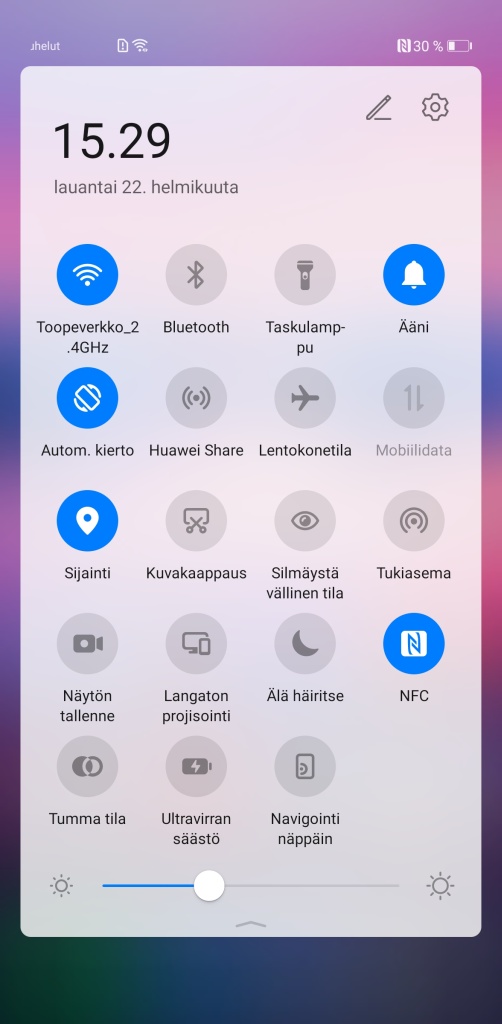 Mate 30 Prosta ei siis löydy lainkaan fyysistä äänenvoimakkuuden säätöpainiketta, vaan äänenvoimakkuutta muutetaan kaksoisnapauttamalla näytön reunaa kummalla tahansa puolella ja liu’uttamalla sitä sen jälkeen pystysuunnassa. Pienen totuttelun jälkeen ominaisuus tuntui toimivan varsin hyvin, mutta tietyissä tilanteissa fyysisiä painikkeita jäi edelleen kaipaamaan (esimerkiksi äänenvoimakkuuden säätö puhelimen ollessa taskussa ei onnistu).