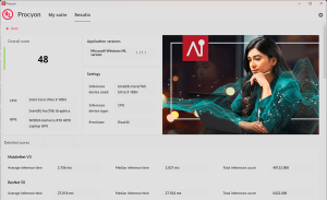 Ajoimme myös muutaman tuottavan työn suorituskykyä mittaavan 3DMark Procyon -testin, joiden pisteille meillä ei ole toistaiseksi verrokkeja, mutta tulokset on nähtivissä yllä olevista kuvista.