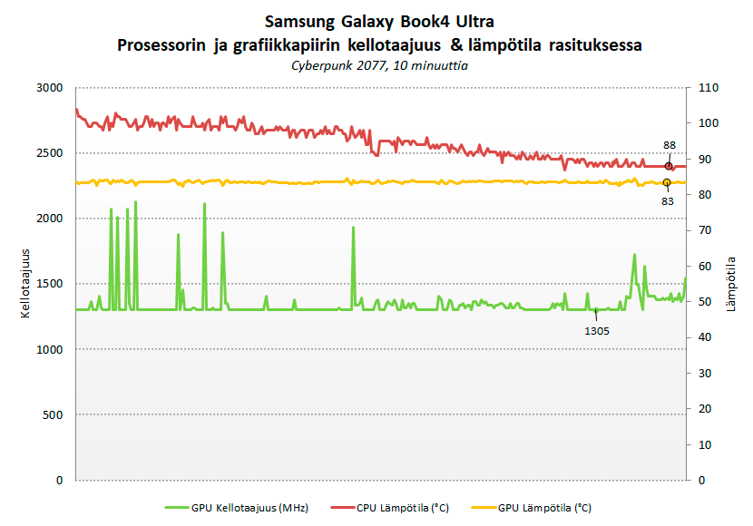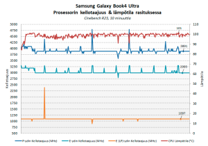 Käytännössä Intelin Core Ultra 9 185H -prosessori toimi Erinomainen suoritusteho -tilassa kaikkien ytimien Cinebench R23-rasituksessa P-ytimien osalta noin 3,6-3,9 GHz:n, E-ytimien osalta noin 3 GHz:n ja E-LP-ytimien osalta noin 1,1 GHz:n kellotaajuudella ja lämpötila nousi välittömästi yli 100 asteeseen. Näytönohjaimen grafiikkapiirin lämpötila nousi Cyberpunk 2077 -pelissä reiluun 80 asteeseen, todellisen kellotaajuuden pyöriessä noin 1300 MHz:ssä. Pelirasituksessa prosessorin lämpötila laski ja tasaantui vajaaseen 90 asteeseen.