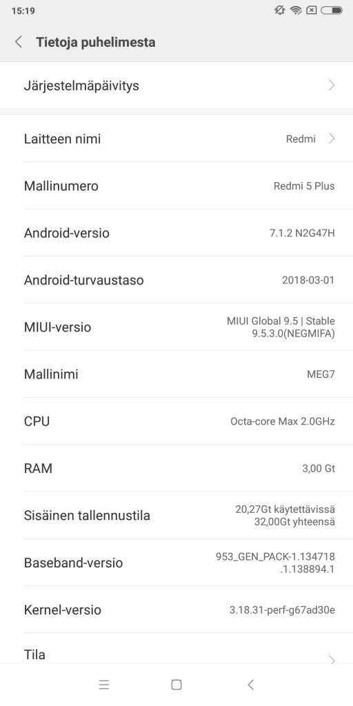 Xiaomi käyttää puhelimissaan (Mi A1:tä lukuun ottamatta) omaa MIUI-käyttöliittymäänsä, joka on käytännössä Androidin päälle toteutettu raskas kustomointi. Redmi 5 Plussassa pohjana on vanhahko Android 7.1.2 Nougat ja sen päälle yritys julkaisi aivan hiljattain tuoreen MIUI 9.5 –päivityksen, joka sisältää ensimmäistä kertaa virallisesti myös suomenkielen. Vaikka Xiaomi roikkuu turhan pitkään vanhoissa Android-versioissa, on korjauksia ja MIUI-uudistuksia sisältäviä päivityksiä tarjolla varsin usein. Myös Android-tietoturvakorjaukset ovat varsin hyvin ajan tasalla ja uusin päivitys toi mukanaan maaliskuun korjausversion.