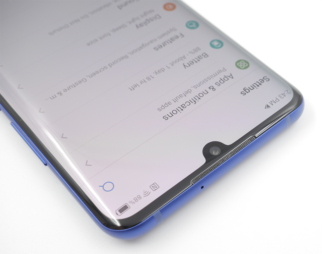 ZTE Axon 10 Pro:n takalasi on testikappaleemme osalta sininen ja väri on ainoa vaihtoehto Suomessa myytävissä malleissa. Takalasin väriin on haettu selkeää metallivärin vivahdetta, mutta mitään erityisempää syvyysefektiä ei takalasissa ole havaittavissa.