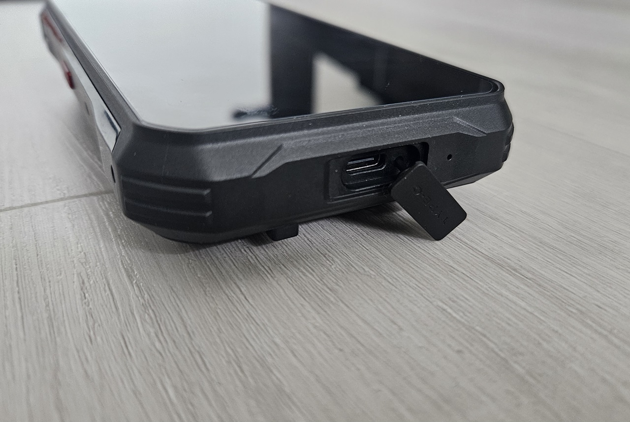 Alapäädyn USB-C-liitäntä on suojattu sormin avattavalla läpällä. Vasemmalla kyljellä on punainen pikakomentonäppäin, jolle pääsee asetuksista määrittämään haluamansa toiminnot sekä kerta- että tuplapainallukselle ja pitkälle painallukselle. Valittavina toimintoina on esimerkiksi salamavalon sytyttäminen taskulampuksi tai vaikkapa ääninauhurisovelluksen käynnistäminen tai näyttökuvan ottaminen.