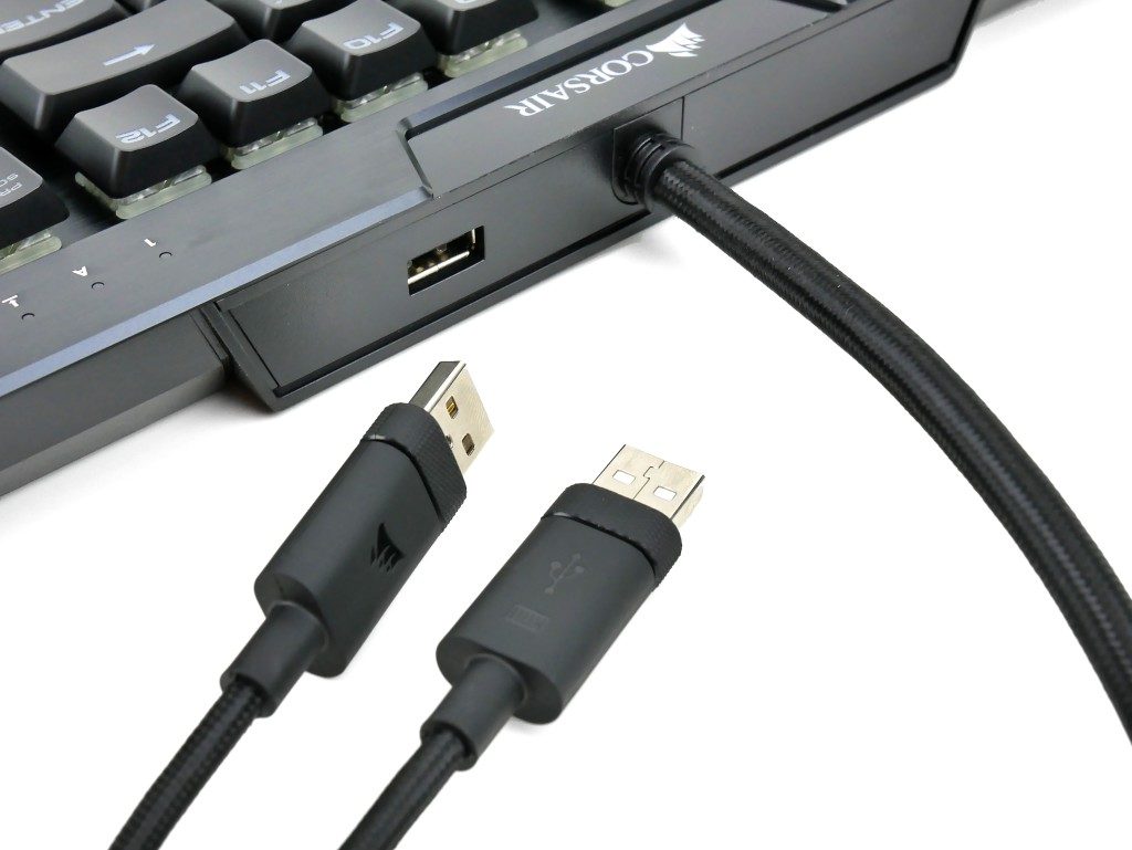 Näppäimistön takareunan keskelle kiinnittyy 1,8-metrinen suojapunoksella päällystetty USB-kaapeli, joka on kiinteästi kiinni näppäimistössä. Kaapelin toisessa päässä on kaksi USB 2.0 Type-A –liitintä, joista toinen on tarkoitettu itse näppäimistölle ja toinen näppäimistön takareunasta löytyvälle USB-läpivientiliitännälle, johon voi kytkeä esimerkiksi hiiren tai muistitikun.