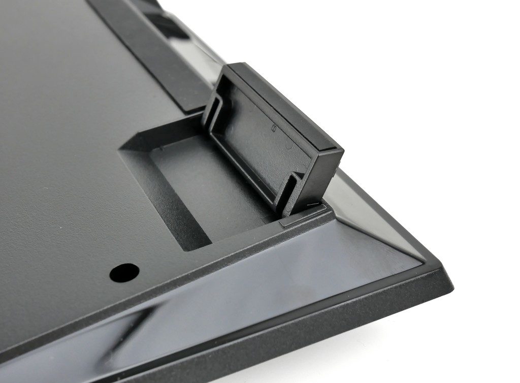 Havitin pohja on karheapintaista mustaa muovia ja sen keskiosaan on toteutettu pieni upotus. Pohjan etunurkkiin on sijoitettu kapeat kumitassut ja vastaavasti takanurkissa on ylösnostettavat koroketassut, joiden päissä on myös kumimaista materiaalia pitoa lisäämässä. Näppäimistö kaipaisi kumitassua ja korokejalkaa myös pohjan keskiosaan, sillä voimakkaammin näppäimiä painaessa näppäimistö pääsee joustamaan hieman keskikohdastaan. Keskelle näppäimistön pohjan etureunaa on muotoiltu pieni muovinysty, mutta se ei yllä koskettamaan pöydän pintaa, eikä siten estä painumista. Onneksi näppärä tee-se-itse käyttäjä pystyy lisäämään halutessaan pohjaan lisätassut, mikä korjaa ongelman.