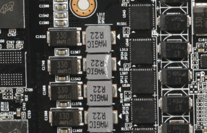 Virransyöttöä ohjataan ensin uPI Semiconductorin 8-vaiheisella UP9511-ohjainpiirillä, josta lähtevät kuusi signaalia jaetaan kolmelle UP1911P-piirille (doubler) tuplattavaksi, kuten Asuksen ROG Strixissä. Jokainen grafiikkapiirin vaihe rakentuu Fairchildin Smart FDMF5823DC Power Stage -moduulista, johon on integroitu MOSFET-transistori ja draiveri, Magic R22 -kelasta ja tantaalikondensaattorista.