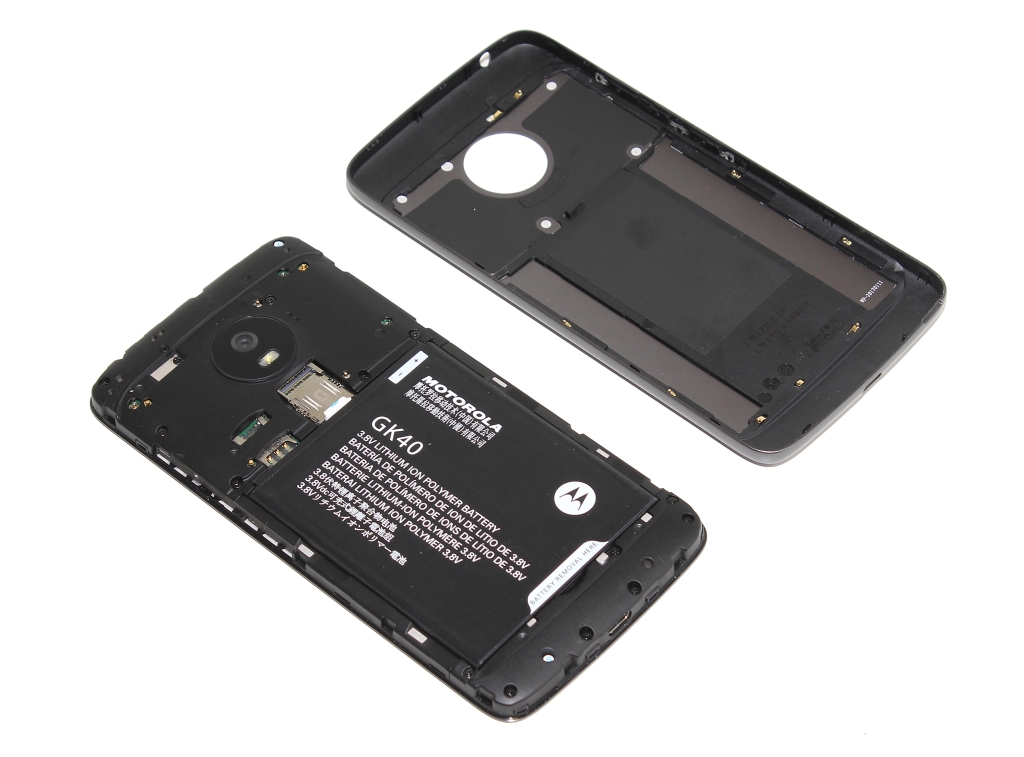 Toisin kuin valtaosassa nykypäivän älypuhelimista, Moto G5:n takakuori on irrotettavaa mallia. Irrottaminen on helpointa aloittaa alapäätyyn muotoillusta pienestä lovesta. Takakuoren alla on paikka puhelimen 2800 mAh akulle, joka on myös irrotettavaa mallia.