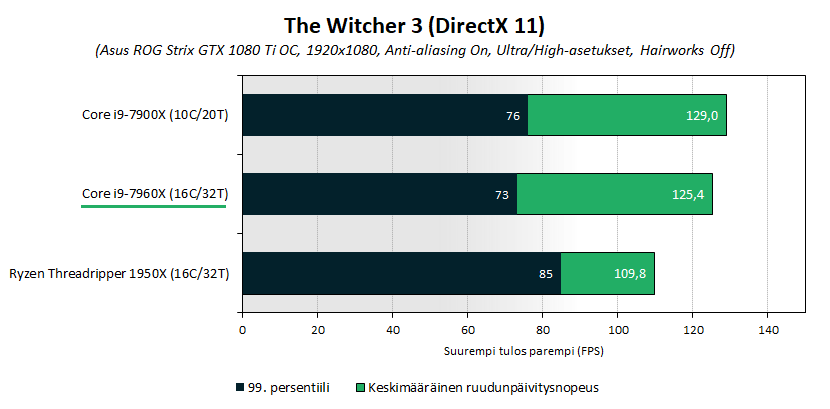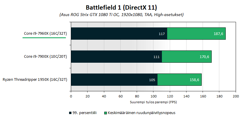 Suurimassa osassa prosessoritestejä Core i9-7960X ja Ryzen Threadripper 1950X olivat joko tasoissa tai testistä riippuen jompi kumpi oli 5-10 % suorituskykyisempi. Muutamissa testeissä kuten H.265-enkoodauksessa ja Coronassa ero venähti 7960X:n hyväksi 20 %:iin.