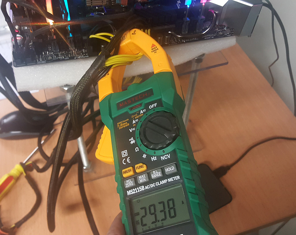 Prosessorin virrankulutukseksi mitattiin pihtimittarilla ATX +12V -liittimistä noin 29,5 ampeeria, joka tarkoittaa noin 85 % teoreettisella hyötysuhteella noin 300 watin tehonkulutusta.