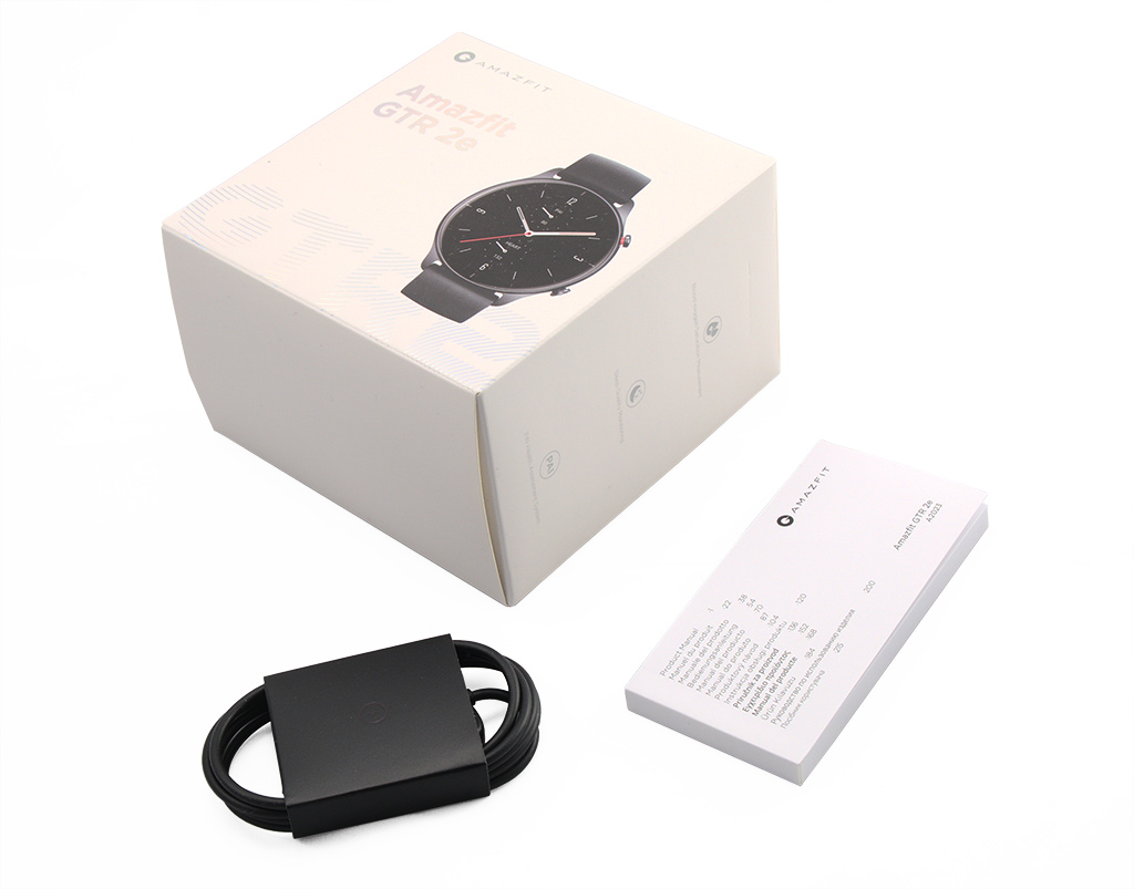 Kello toimitetaan valkoisessa pahvipakkauksessa, jonka päällä on värillinen kuva itse laitteesta ja sen mallinimi. Toimitussisältöön kuuluu itse kellon lisäksi vain ohjekirja ja latauskaapeli. Muista älykelloista totuttuun tapaan omaa verkkovirtalähdettä ei Amazfit GTR 2e:n mukana toimiteta. Tarkoitukseen sopii mikä tahansa standardinmukainen USB Type-A -liitännällinen laturi.