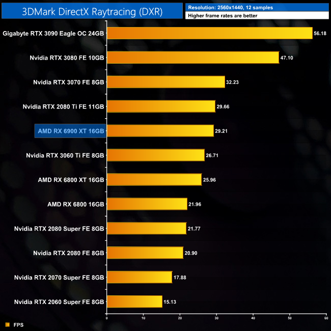 3DMarkin uudessa pelkästään säteenseurantaa käyttävässä DXR-testissä GeForce RTX 30 -sarjan näytönohjaimet ovat selvästi uusia Radeoneita suorituskykyisempiä. RTX 3090:n ruudunpäivitysnopeus oli jopa 89 % parempi kuin 6900 XT:llä.