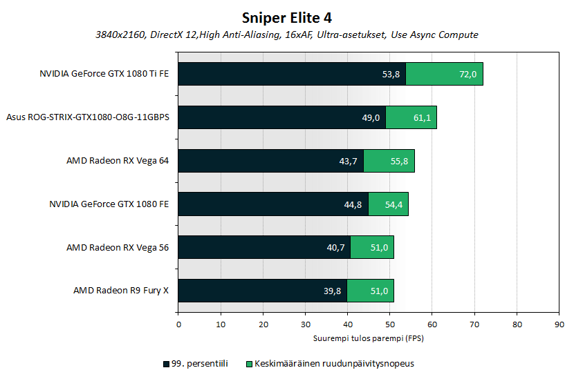 Sniper Elite 4:ssä Vega 64:n ruudunpäivitysnopeus oli 1,4 FPS:ää eli noin 3% parempi kuin GTX 1080 FE:llä.