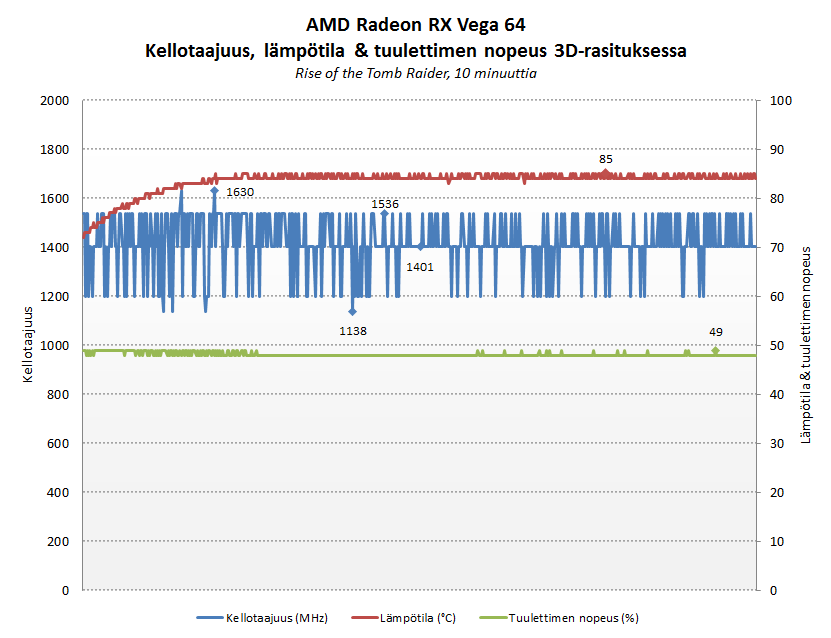 Todellisuudessa Vega 10 -grafiikkapiirin kellotaajuus seilasi 3D-rasituksessa 1200-1536 MHz:n välimaastossa ja grafiikkapiirin lämpötila nousi parissa minuutissa 85 asteeseen. Tuulettimen kierrosnopeus oli koko ajan 48-49 % (2400 RPM).