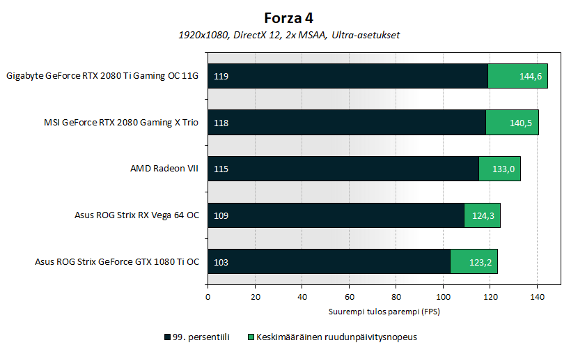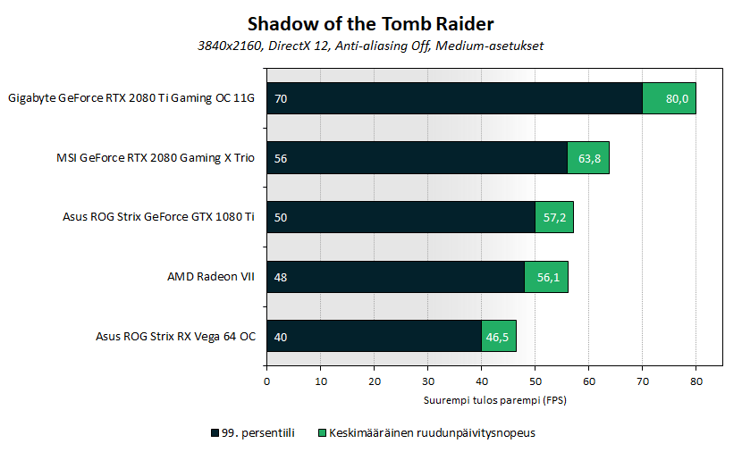 GeForce RTX 2080:een verrattuna Radeon VII oli suorituskyvyssä vahvoilla Battlefield V- ja Resident Evil 2 -peleissä, Forza 4 oli kohtalaisen tasainen ja Shadow of the Tomb Raider ja Assassin’s Creed Odyssey menivät RTX 2080:n nimiin. 4k UHD -resoluutiolla suurin ero Radeon VII:n hyväksi nähtiin Battlefield V:ssä noin 9 % erolla ja GeForce RTX 2080 oli puolestaan Shadow of the Tomb Raiderissa 14 % suorituskykyisempi. Alhaisemmille resoluutoille siirryttäessä GeForce RTX 2080 alkoi olla enemmän niskan päällä.