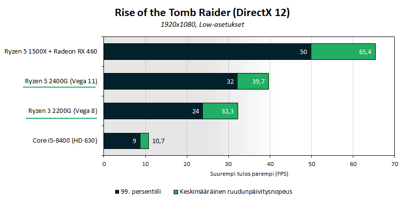 Rise of the Tomb Raider testattiin Low-kuvanlaatuasetuksilla pelaamalla peliä 60 sekunnin ajan ja tallentamalla OCAT-ohjelmalla keskimääräinen ruudunpäivitysnopeus ja 99. persentiili.