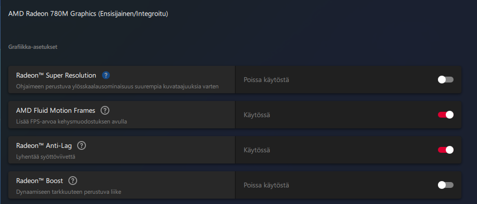Kaikki suorituskykyä kuvanlaadun ja sisääntuloviiveen kustannuksella parantavat tekniikat, kuten FSR 2, FSR 3 ja AFMF ovat erittäin tervetulleita juuri Radeon 780M:n tapaiselle grafiikkaohjaimelle, jolla täytyy jo lähtökohtaisesti käyttää alhaisia kuvanlaatuasetuksia. Tässä yhtälössä kuvanlaatu ei enää juurikaan voi huonontua, mutta korkeammalla ruudunpäivitysnopeudella saavutetaan miellyttävämpi pelikokemus.