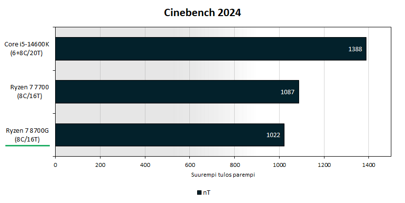 Uuden Cinebench 2024 -renderöintitestin kaikkien ytimien testissä Ryzen 7 7700 oli noin 6 % ja 14600K noin 36 % suorituskykyisempi kuin 8700G.