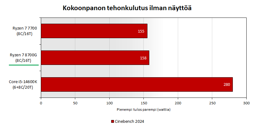 Kokoonpanon tehonkulutus Ryzen 7 7700:llä ja 8700G:llä oli kaikkien ytimien Cinebench R24 rasituksessa lähes tasoissa noin 155 watissa. Core i5-14600K:n tehonkulutus oli jopa 125 wattia korkeampi.