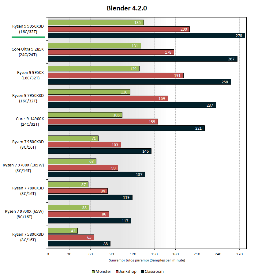 Blender-renderöintitestissä 9950X3D oli 16-18 % suorituskykyisempi kuin 7950X3D ja 5-8 % suorituskykyisempi kuin 9950X.
