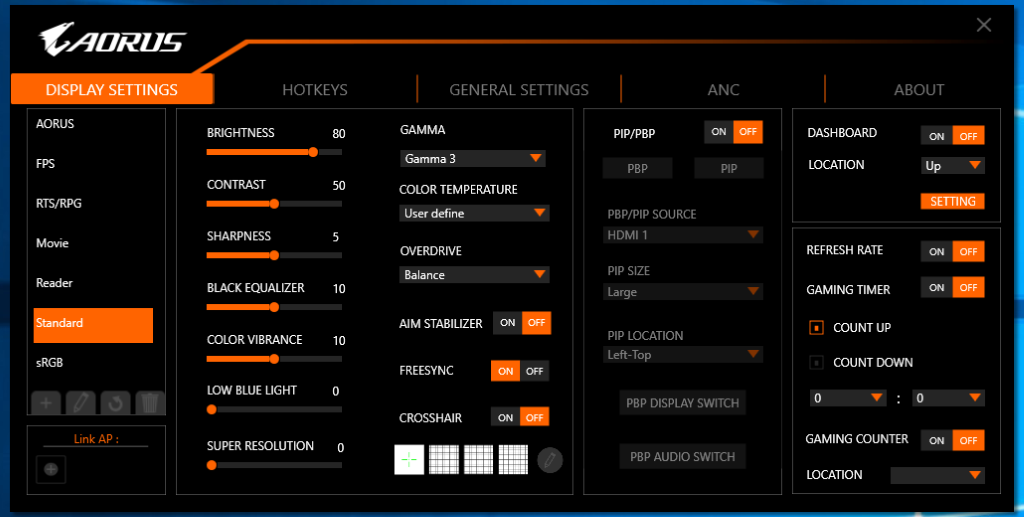 Näyttöä voidaan ohjata käyttöjärjestelmästä käsin OSD Sidekick -ohjelmistolla, jonka avulla näytön kaikkia asetuksia voidaan hallita näppämistöllä ja hiirellä. OSD Sidekick sekä muutama muu ominaisuus vaatii toimiakseen sen, että näyttö on liitetty tietokoneeseen mukana toimitettavalla USB-kaapelilla. Näihin lukeutuu myös dashboard-ominaisuus, jolla voidaan näyttää tietoja kuten näytönohjaimen lämpötila, hiiren DPI ja näytönohjaimen ruudunpäivitysnopeus ilman erillistä ohjelmaa. Testiemme aikana emme saaneet kyseiseen dashboardiin esille kaikkia arvoja, joten tässä saattaa olla myös jotain yhteensopivuusvaatimuksia. Myöskään lyhyehkö testi Aim Stabilizer -tilan käytöstä ei ainakaan testaajalle tuonut juuri mitään lisäarvoa. Huomattavin ominaisuus oli se, että tila pudotti näytön kirkkautta reilusti, eikä sitä voinut säätää tilan ollessa päällä.