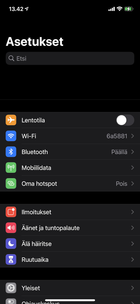 Laturi ei muodostunut ongelmaksi, nytkin tuuppasin työpuhelimen laturiin (15W) vanhalla piuhalla – noita USB A – Lightning -kaapeleita on kertynyt vähän joka huoneeseen sekä autoon. Enimmäkseen lataan puhelimeni öisin, joten pikalataus on sekin itselle niin ja näin. Mutta voihan tuon ainakin jatkossa tuupata julkisten kahviloiden latausalustalle..
