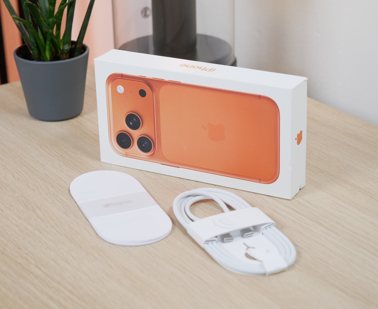 iPhone 17 Pron pakkaus noudattaa edellisistä sukupolvista tuttua tyyliä, eli väriltään valkoiseen litteään pahvirasiaan on painettu iPhone-tekstit ja omenalogot sekä kanteen värillinen kuva puhelimesta. Edellisestä sukupolvesta poiketen kannessa oleva puhelimen kuva on etupuolen sijasta takakuoresta.