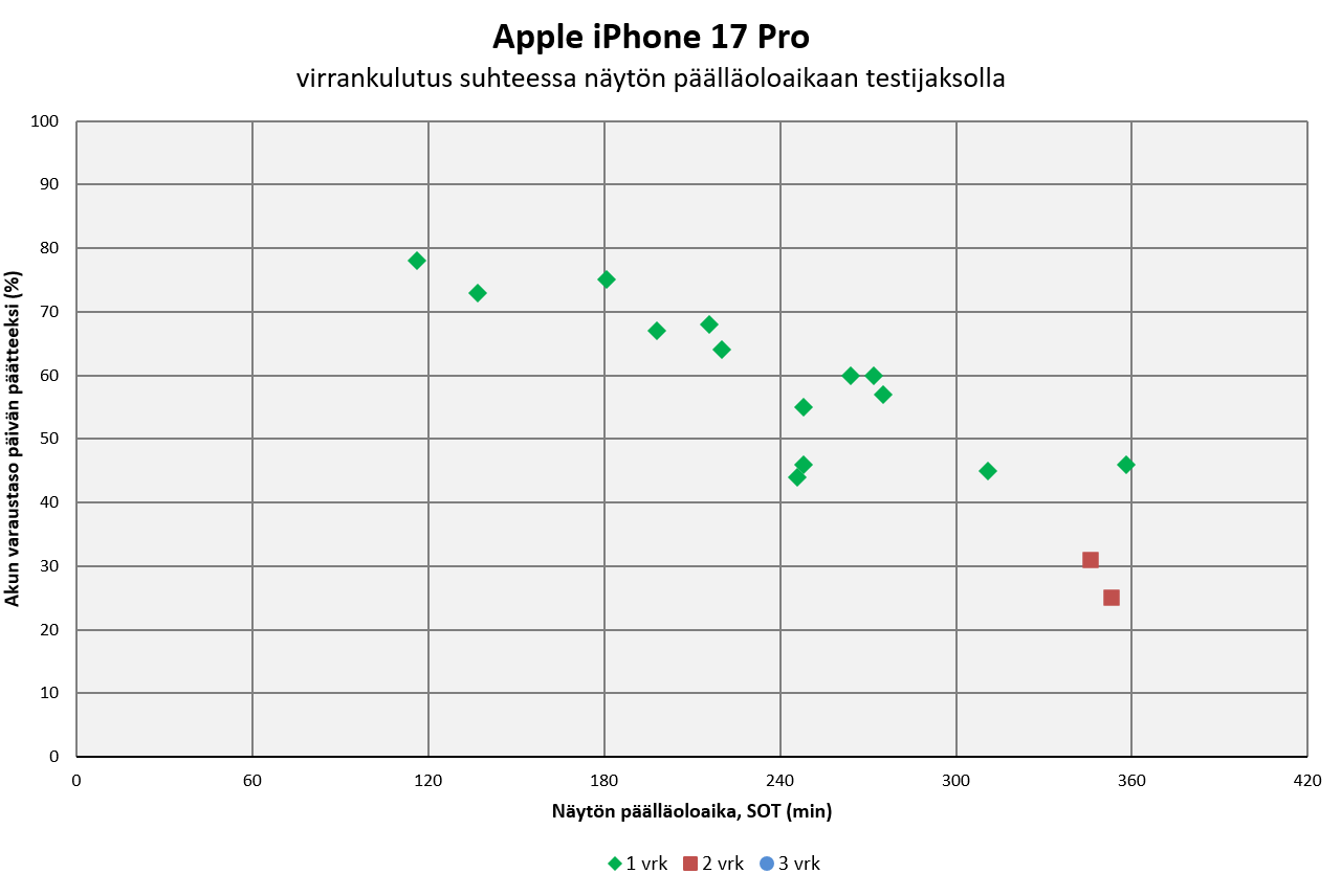 iPhone 17 Pron akunkesto oli testijaksolla keskimääräistä parempaa ja yhdellä latauksella selvittiin vaivatta kahden päivän yli. Tyypillisesti 2-3 tunnin näytön päälläoloajalla akun varauksesta oli päivän päätteeksi jäljellä 70-80 % ja hieman raskaammalla neljän tunnin päälläoloajalla noin 50-60 %. Testijakson käyttökokemusten pohjalta virtaa vaikuttaisi riittävän laskennallisesti noin 9 tunnin näytön päälläoloaikaan, niin että yhden päivän ylitys vielä onnistuisi.
