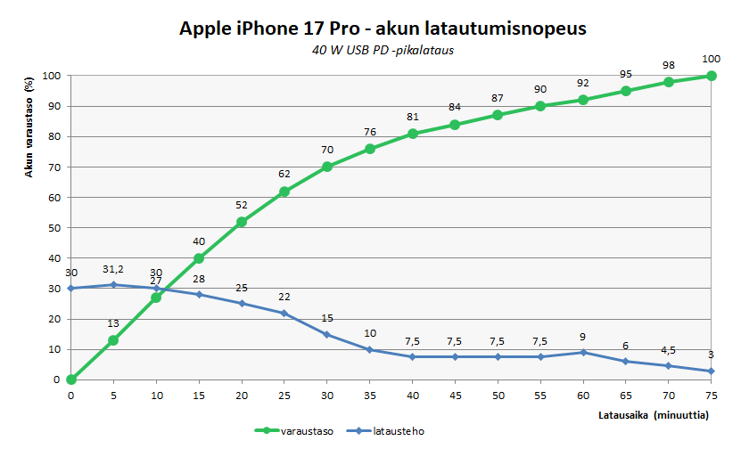 iPhone 17 -malliston maksimilatausteho on kasvanut 40 wattiin ja valmistajan ilmoittama latausnopeus on parantunut viime sukupolvesta. Tämä näkyy myös käytännön testeissä ja Apple onkin onnistunut hilaamaan itsensä hiljalleen keskijoukkoon markkinoiden hitaimpien latautujien ryhmästä, vaikkei edelleenkään ole lähelläkään markkinoiden nopeimpien lukemia.