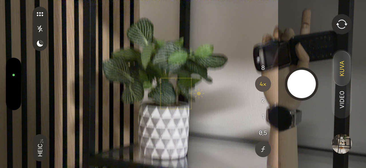 Uuden korkearesoluutioisen telekameran etuna edelliseen sukupolveen nähden on mahdollista rajata sensorin keskeltä 8x-tele vastaavia otoksia. Ottamiemme testikuvien perusteella 8x-tila pystyy taltioimaan kuviin hyvässä valaistuksessa selvästi enemmän yksityiskohtia kuin 4x-tila, joten ominaisuus on käyttökelpoinen jatke polttovälialueeseen. Pikselitasolla voi huomata, että prosessointi silottelee 8x-kuvista kohinaa pois selvästi 4x-kuvia enemmän.