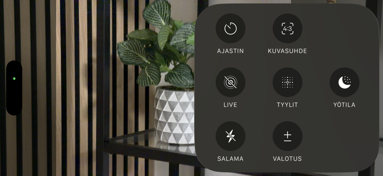 Kamerasovelluksen yleisilme on tuttuun tyyliin melko pelkistetty, mutta iOS 26:n myötä kamerasovelluksen käyttöliittymää on yksinkertaistettu entisestään, eikä välttämättä hyvään suuntaan. Näkyvillä on vain valokuva- ja videotilan valitsimet – muut kuvaustilat tulevat esiin vasta pyyhkäisemällä. Valikon olemassaolosta ei ole mitään indikaatiota, joten toteutus ei ole intuitiivisimmasta päästä. Sama koskee myös lisätoimintojen (mm. salama, ajastin yms) valikkoa, joka aukeaa myös pyyhkäisemällä oikeasta reunasta keskelle päin.