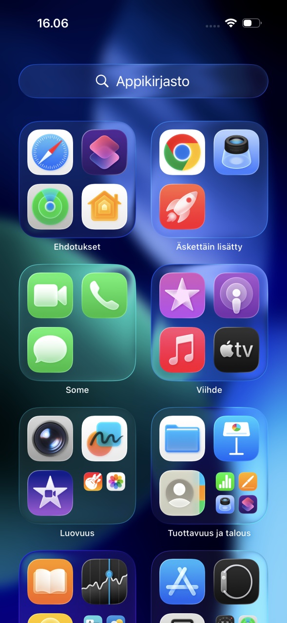Uutta ja helposti erottuvaa on Liquid Glass -käyttöliittymäulkoasu, joka jakaa varmasti jonkin verran mielipiteitä. Omaan makuuni edellisen iOS 18 -version ulkoasu oli hillityn tyylikäs ja uusi Liquid Glass on läpikuultavine ja huurrettuine tehosteineen sekä hyllyvine ja joustavine animaatioineen hieman lapsellinen tuulahdus jostain Windows XP:n ja Vistan aikakaudelta. Lisäksi kokemus tuntui paikoin vielä hieman viilaamattomalta, sillä esimerkiksi käyttöliittymäanimoinneissa oli havaittavissa paikoin pientä nykimistä.
