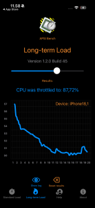 Hieman yllättäen piirin throttlaaminen ei vaikuttaisi vähentyneen mainittavasti edelliseen sukupolveen nähden, vaikka Apple perusteli alumiinirakenteeseen siirtymistä juuri jäähdytyksen parantumisella. Testeissämme 17 Pro sai 3DMark Wild Life Extreme -grafiikkarasitustestissä 64–67 % tuloksia (suorituskyvyn lasku maksimiin nähden), jotka ovat käytännössä samalla tasolla edeltäjän kanssa. Prosessorirasitusta testaavassa APSI Bench -testissä suorituskyky laski noin 85-88 %:iin maksimista, kun edeltäjämallissa tulos oli lähestulkoon vastaava 84 %. Lukemat ovat myös varsin tavanomaista hyvää keskitasoa nykypäivän high-end-puhelimelle.